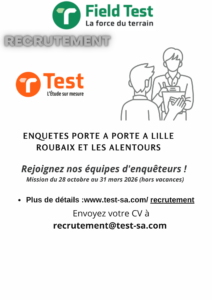 Zone : département du Nord en région Hauts-de-France. Métropole européenne de Lille (MEL), avec 89 autres communes dont Lille. Période : À partir du 18 novembre au 18 décembre hors vacances scolaires, puis reprise en janvier jusqu’à mars 2026. Type de mission : CDDU / Contrat payé à l’enquête Réunion d’information : Réunions d’info